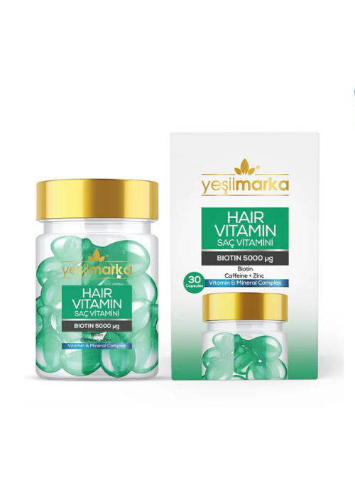 Yeşilmarka Hair Vitamin – Biotin & Caffeine, специально разработанных для здоровья и красоты ваших волос, и вы увидите, как ваши волосы преображаются.